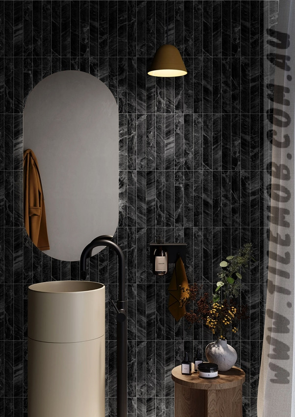 BLACK SATIN MARBLE LOOK CONCAVE SUBWAY TILE (50x300mm)